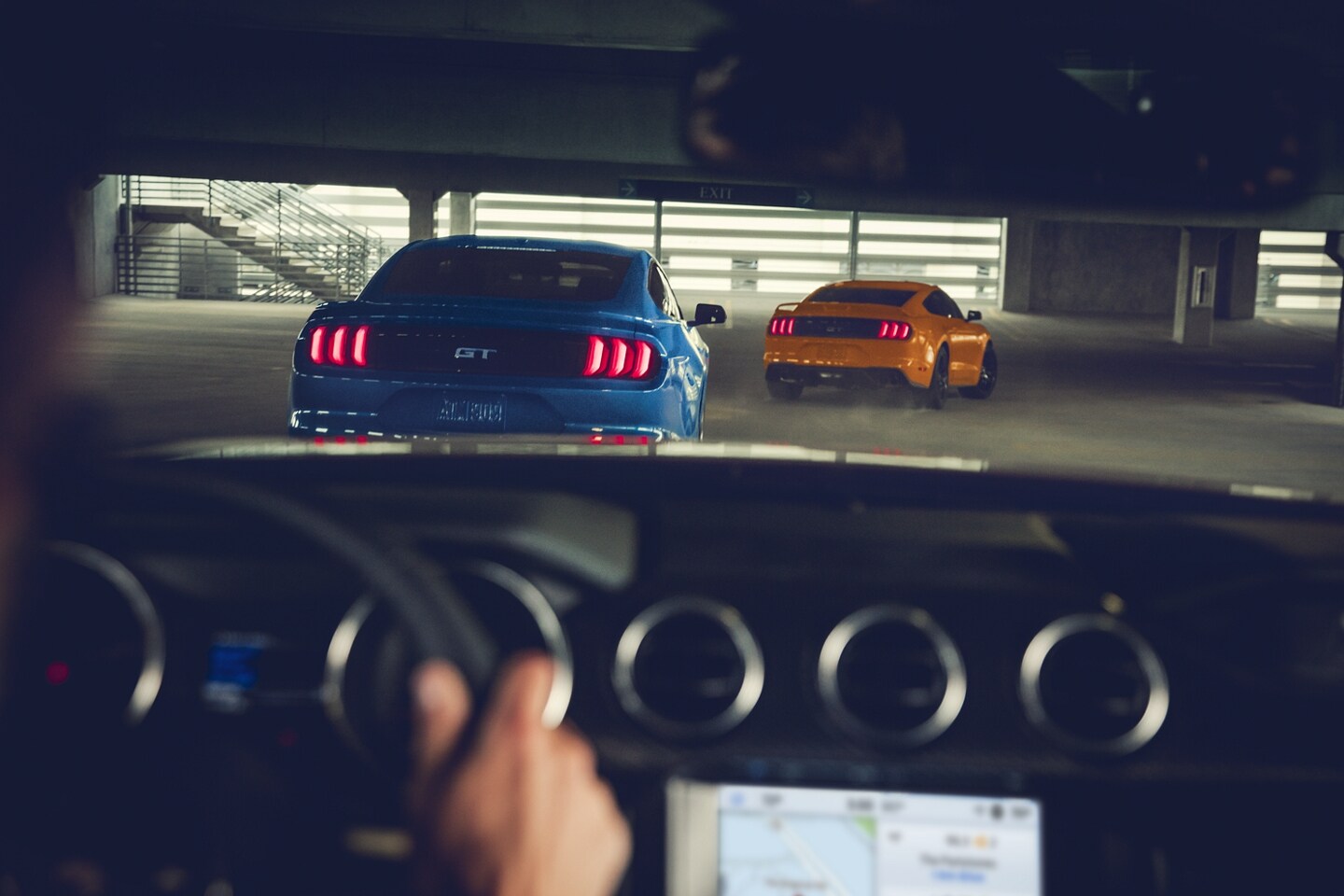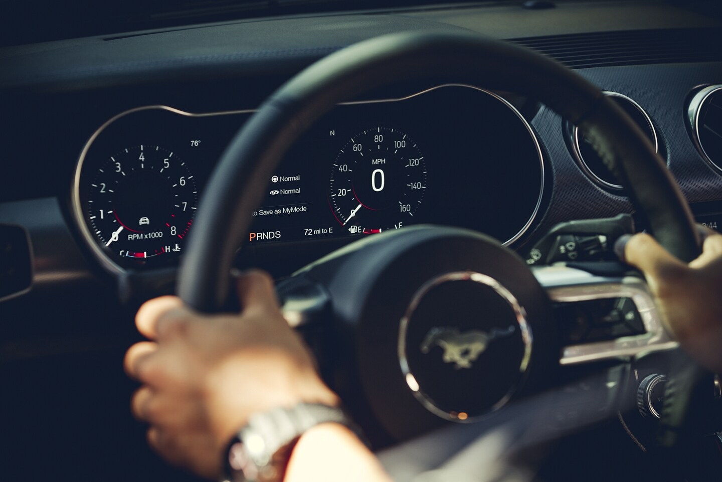 The Mustang interior has everything you need to stay comfortable on the road. All models have power windows and locks, a cabin air filter, a leather-trimmed tilt-and-telescoping steering wheel, cargo area lighting, an auto-dimming rearview mirror, and ambient lighting.