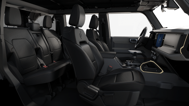 Black Appearance Package (Black Molded-In-Color Door Handles, Black Molded-In-Color Fender Flares, Black Molded-In-Color Sideview Mirror Caps, and Black-Painted Molded-In-Color Grille), Equipment Group 334A Lux Package (2-Door Intelligent Access w/Lock/Unlock, 360-Degree Camera, Adaptive Cruise Control, Ambient Footwell Lighting, Connected Navigation, Dr & Pass Illuminated Sliding Visor Vanity Mirrors, Dual Smart Charging USB Ports, Dual-Zone Electronic Automatic Temperature Control, Evasive Steering Assist, Front Parking Sensors, Front Row Heated Seats, Information on Demand Panel, Power Outlet - Back Side of Center Floor Console, Radio: B&O Sound System by Bang & Olufsen, Rear Parking Sensors, Sideview Mirrors, and Universal Garage Door Opener), Sasquatch Package (High Clearance Fender Flares, High Clearance Suspension, Position-Sensitive Bilstein Shock Absorbers, and Wheels: 17 Carbonized Gray Painted Aluminum), 4-Wheel Disc Brakes, 7 Speakers, ABS brakes, Air Conditioning, Alloy wheels, AM/FM radio: SiriusXM with 360L, AM/FM Stereo, Auto High-Beam Headlamps, Auto High-beam Headlights, Auto-dimming Rear-View mirror, BLIS Blind Spot Information System, Brake assist, Compass, Delay-off headlights, Driver door bin, Driver vanity mirror, Dual front impact airbags, Dual front side impact airbags, Electronic Stability Control, Emergency communication system: 911 Assist, Exterior Parking Camera Rear, Front anti-roll bar, Front Bucket Seats, Front Center Armrest, Front fog lights, Front License Plate Bracket, Front reading lights, Front wheel independent suspension, Fully automatic headlights, Hard Top Sound Deadening Headliner, Heated door mirrors, Heated front seats, Heated steering wheel, Illuminated entry, Integrated roll-over protection, Internet access capable: FordPass Connect, Lane-Keeping System, Leather Shift Knob, Low tire pressure warning, Marine Grade Vinyl Heated Bucket Seats, Occupant sensing airbag, Outside temperature display, Overhead airbag, Overhead console, Panic alarm, Passenger door bin, Passenger vanity mirror, Power door mirrors, Power steering, Power windows, Pre-Collision Assist w/Automatic Emergency Braking, Radio data system, Rear-View Camera, Rear-Window Defroster & Washer, Remote keyless entry, Security system, Shadow Black Painted Hard Top, SiriusXM w/360L, Speed control, Split folding rear seat, Steering wheel mounted audio controls, SYNC 4, Tachometer, Telescoping steering wheel, Tilt steering wheel, Traction control, Trip computer, Variably intermittent wipers, Voltmeter, and Wheels: 17 Carbonized Gray-Painted Aluminum.