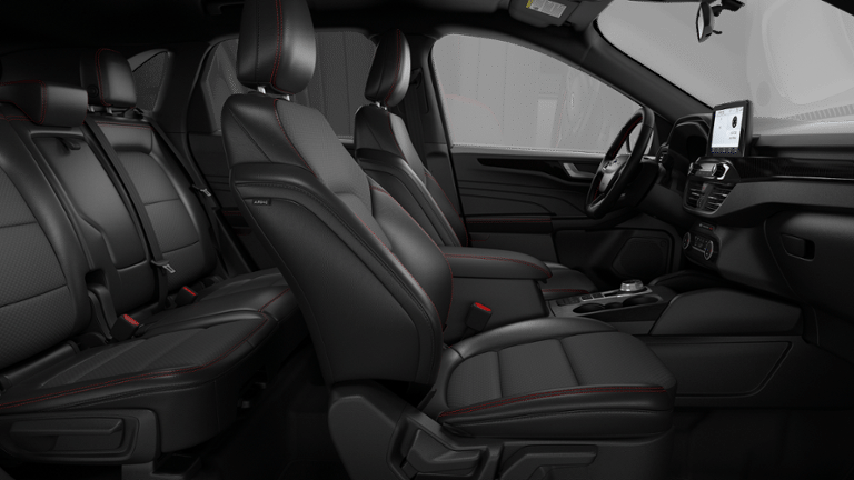 3.81 Axle Ratio, 4-Way Manual Front Passenger Seat, 4-Wheel Disc Brakes, 6 Speakers, 8-Way Power Driver Seat, ABS brakes, Air Conditioning, Alloy wheels, AM/FM radio: SiriusXM 360L, Auto High-beam Headlights, Automatic temperature control, Brake assist, Bumpers: body-color, Compass, Delay-off headlights, Driver door bin, Driver vanity mirror, Dual front impact airbags, Dual front side impact airbags, Electronic Stability Control, Emergency communication system: SYNC 4 911 Assist, Ford App, Four wheel independent suspension, Front anti-roll bar, Front Bucket Seats, Front Center Armrest, Front dual zone A/C, Front License Plate Bracket, Front reading lights, Fully automatic headlights, Heated steering wheel, Illuminated entry, Knee airbag, Low tire pressure warning, Occupant sensing airbag, Outside temperature display, Overhead airbag, Overhead console, Panic alarm, Partial Vinyl/Cloth Front Sport Contour Bucket Seats with Red Stitching, Passenger door bin, Passenger vanity mirror, Power door mirrors, Power driver seat, Power Liftgate, Power steering, Power windows, Radio data system, Radio: AM/FM Stereo with SiriusXM 360L, Rear anti-roll bar, Rear reading lights, Rear seat center armrest, Rear window defroster, Rear window wiper, Remote keyless entry, Speed control, Speed-sensing steering, Speed-Sensitive Wipers, Split folding rear seat, Spoiler, Sport steering wheel, Steering wheel mounted audio controls, SYNC 4, Tachometer, Telescoping steering wheel, Tilt steering wheel, Traction control, Trip computer, Variably intermittent wipers, and Wheels: 18 Rock Metallic Painted Aluminum.