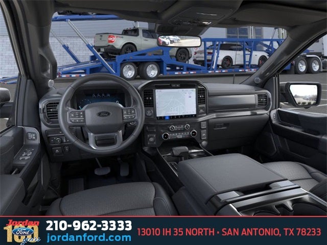 Ford Connectivity Package (1-Year Included), FX4 Off-Road Package (4x4 FX4 Off-Road Bodyside Decal, Hill Descent Control, Monotube Rear Shocks, Off-Road Tuned Front Shock Absorbers, Rock Crawl Mode, and Tray Style Floor Liner Without Carpet Mats), Internet access capable: 5G Modem - Ford Connectivity Package, Lariat Black Appearance Package (ActiveX Trimmed Bucket Seats, Black Exterior Badging, Black Grille, Black Taillamp Bezels, Body-Color Front and Rear Bumpers, Dark Interior Appliques, Gray Box Side Decal, and Matte Black Tailgate F-150 Decal), 4WD, 4-Wheel Disc Brakes, 8 Speakers, ABS brakes, Air Conditioning, Alloy wheels, AM/FM radio: SiriusXM with 360L, Auto High-beam Headlights, Auto-dimming door mirrors, Auto-dimming Rear-View mirror, Automatic temperature control, Brake assist, Bumpers: chrome, Chrome wheels, Compass, Delay-off headlights, Driver door bin, Driver vanity mirror, Driver's Side SecuriCode Keyless-Entry Keypad, Dual front impact airbags, Dual front side impact airbags, Electronic Stability Control, Emergency communication system: SYNC 4 911 Assist, Front anti-roll bar, Front Bucket Seats, Front Center Armrest, Front dual zone A/C, Front fog lights, Front License Plate Bracket, Front reading lights, Front wheel independent suspension, Fully automatic headlights, Garage door transmitter, Heated door mirrors, Heated front seats, Heated steering wheel, Illuminated entry, Low tire pressure warning, Memory seat, Navigation system: Connected Navigation, Occupant sensing airbag, Outside temperature display, Overhead airbag, Overhead console, Panic alarm, Passenger door bin, Passenger vanity mirror, Power door mirrors, Power driver seat, Power passenger seat, Power steering, Power windows, Radio data system, Radio: B&O Sound System by Bang and Olufsen, Rain sensing wipers, Rear reading lights, Rear seat center armrest, Rear step bumper, Rear window defroster, Remote keyless entry, Security system, Speed control, Split folding rear seat, Steering wheel mounted audio controls, SYNC 4 with Enhanced Voice Recognition, Tachometer, Telescoping steering wheel, Tilt steering wheel, Traction control, Trip computer, Turn signal indicator mirrors, Twin Panel Moonroof, Variably intermittent wipers, Ventilated front seats, and Wheels: 18 Chrome-Like PVD.